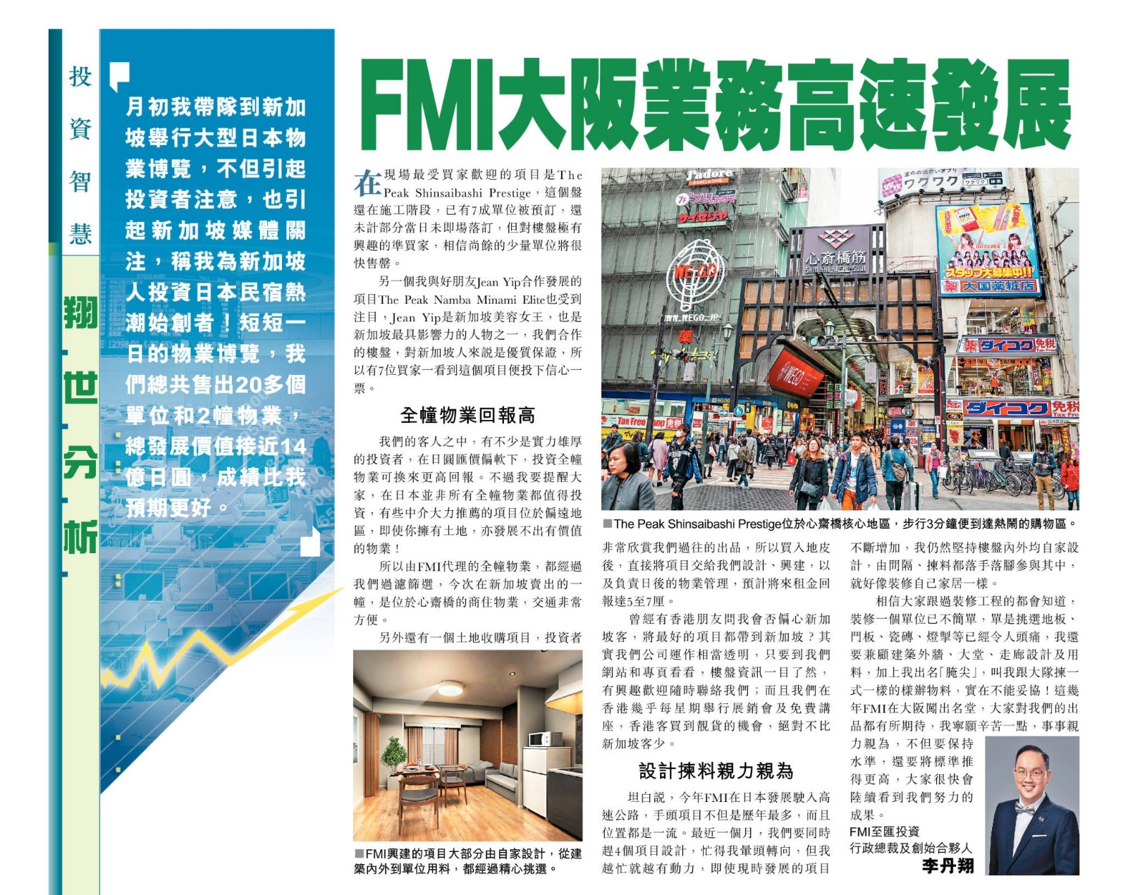 月初我帶隊到新加坡舉行大型日本物業博覽,不止引起投資者注意,也引起了新加坡媒體的關注,稱我為新加坡人投資日本民宿的熱潮始創者,對於這個稱號,我自問敢認第二,也沒有人敢認第一!短短一日的物業博覽,我們總共售出二十多個單位和兩幢物業,總發展價值接近十四億日圓,成績比我所預期的更好。