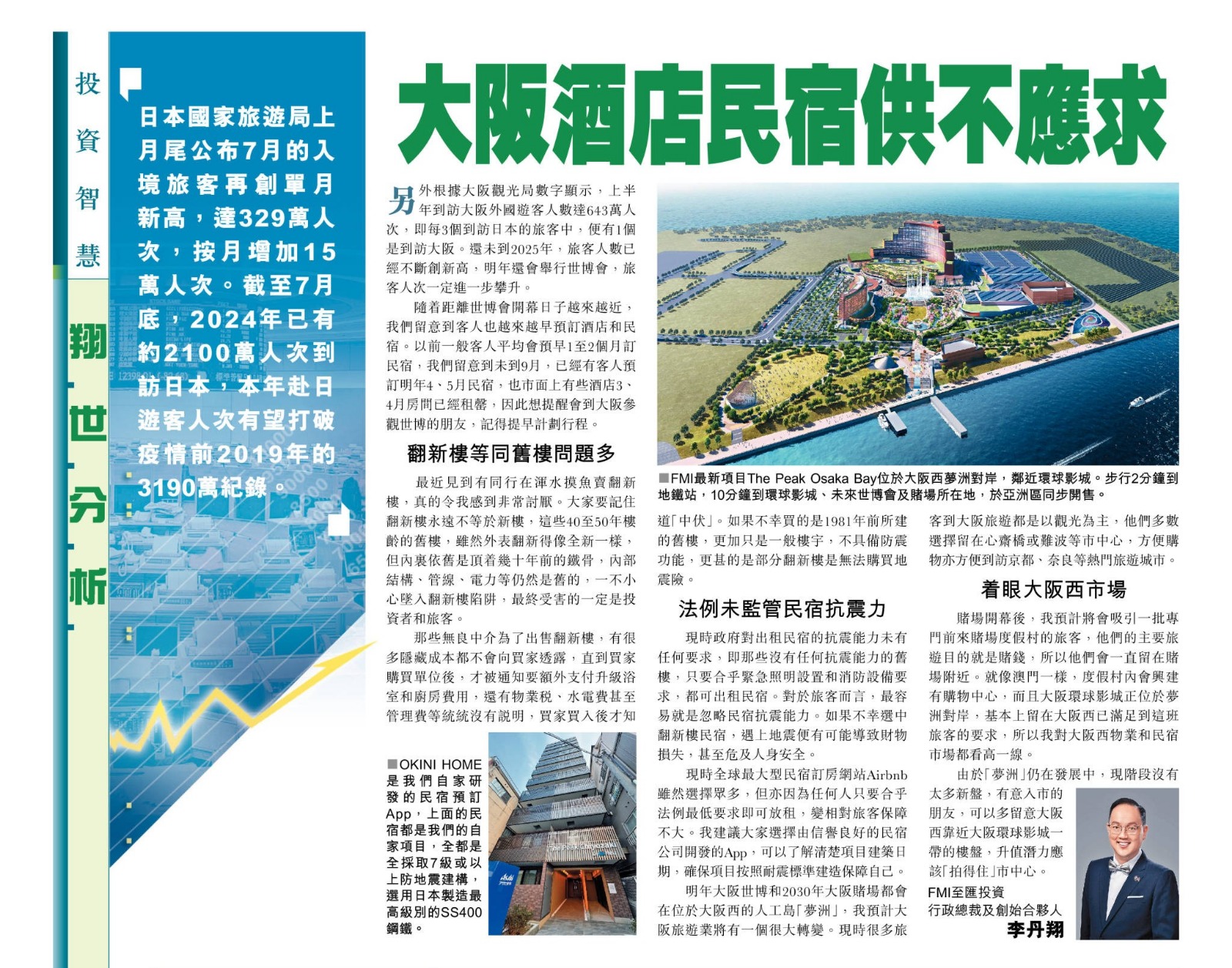 日本國家旅遊局上月尾公布7月的入境旅客再創單月新高,達329萬人次,比6月的314萬人次多了15萬人次。截至7月,2024年已有約2100萬人次到訪日本,本年赴日遊客人次有望打破新冠疫情前2019年的3190萬紀錄。另外,根據大阪觀光局數字顯示,今年上半年到訪大阪的外國遊客人數達到643萬人次,即每三個到訪日本的旅客中,便有一個是到訪大阪。還未到2025年,旅客人數已經不斷創新高,明年還會舉行世博會,旅客數次一定進一步攀升。
