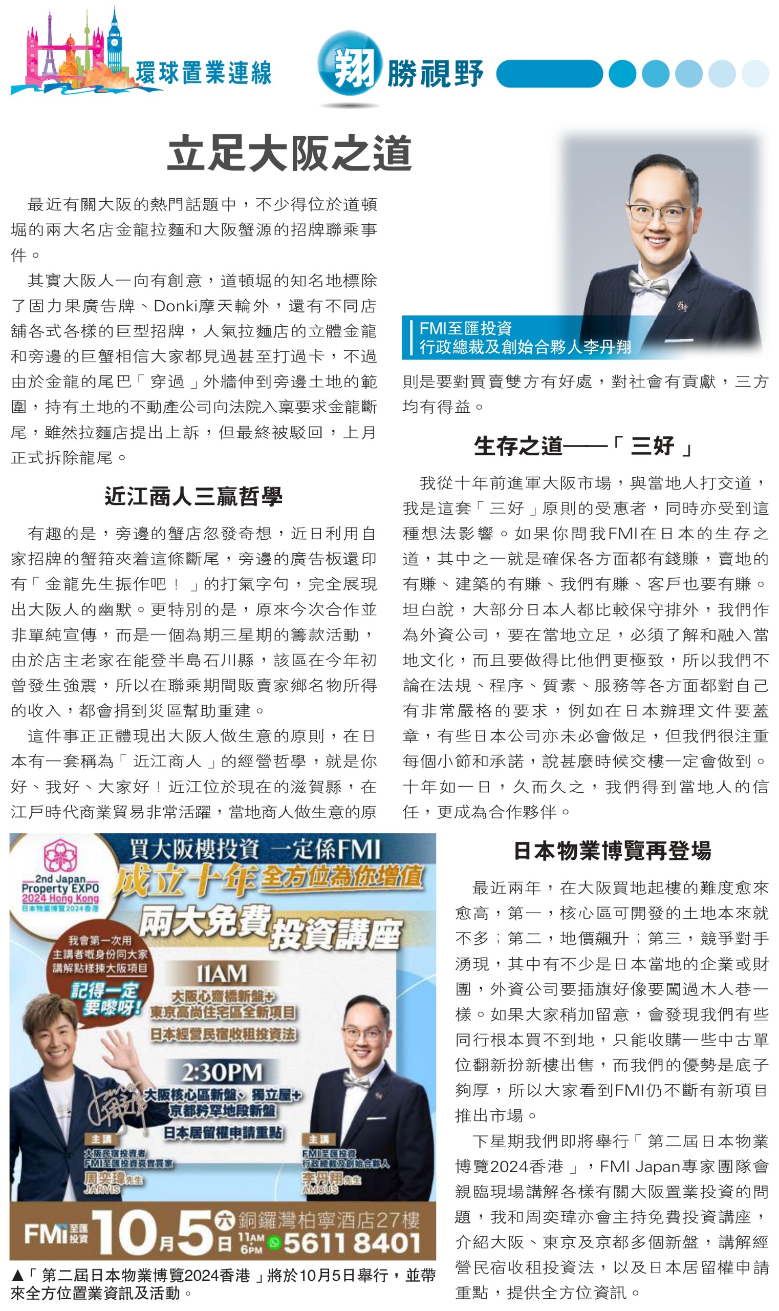 轉眼間,2024年已進入第四季,回想今年大部分時間都在推大阪樓,有人以為我們放棄英國市場,其實不可能。第一,我本身賣英國樓起家,對這個地方有很深情意結,加上我是倫敦忠粉,買倫敦樓從來只會買貴,不會買錯,自用或長線投資根本不會輸;第二,FMI的強項之一是多元化,我經常強調做海外物業不能獨沽一味,因為世界各地的經濟周期不同,一個市場下滑,必會有其他地方冒起,惟有因地制宜、因時制宜,才能確保我們任何時候都穩佔市場一席位。