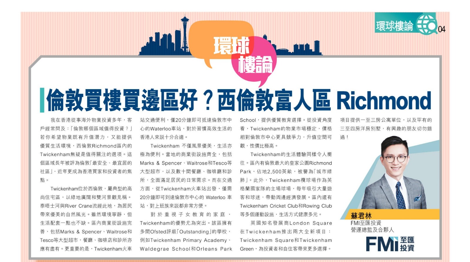 我在香港從事海外物業投資多年,客戶經常問及:「倫敦哪個區域值得投資?」若你希望物業既有升值潛力,又能提供優質生活環境,西倫敦Richmond區內的Twickenham無疑是值得關注的選項。這個區域長年被評為倫敦「最安全、最宜居的社區」,近年更成為香港買家和投資者的焦點。