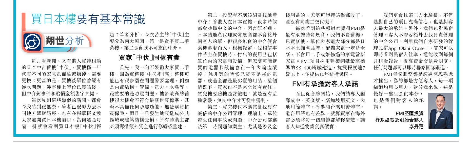 每次看到這些報道都會覺得FMI 是最有承擔的發展商,我們不賣舊樓,只賣新樓,單位內的家電大部分都是日本本土知名品牌,配備的家電一定是全新,不會用二手或維修過的家電當新家電。FMI 的項目採用建築鋼鐵最高標準的SS 400鋼鐵建造,抗震程度達七級以上,並提供十年結構保固的。