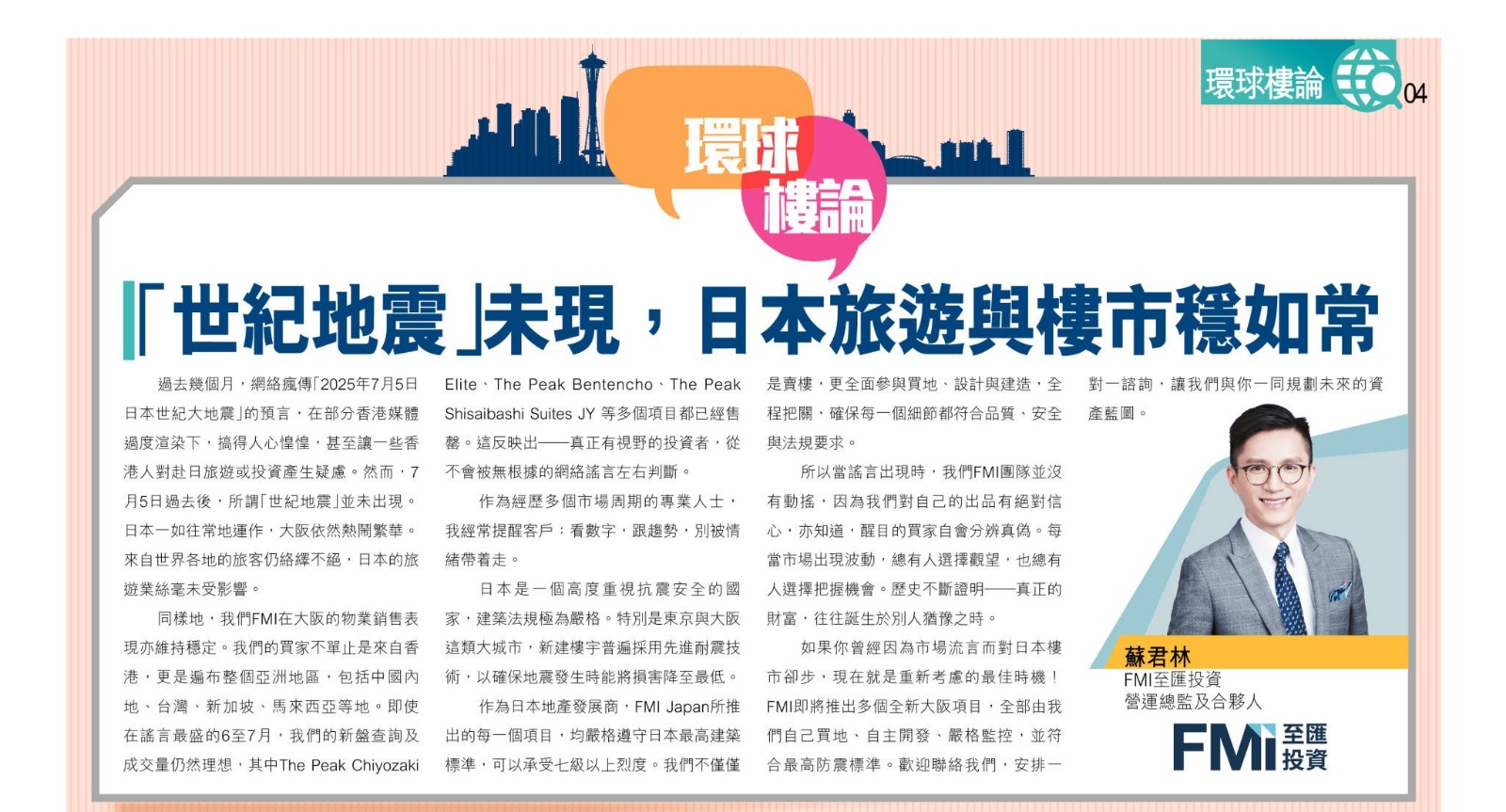 同樣地,我們FMI在大阪的物業銷售表現亦維持穩定。我們的買家不單止是來自香港,更是遍佈整個亞洲地區,包括中國內地、台灣、新加坡、馬來西亞等地。即使在謠言最盛的6-7月,我們的新盤查詢及成交量仍然理想,其中The Peak Chiyozaki Elite、The Peak Bentencho、The Peak Shisaibashi Suites JY 等多個項目都已經售罄。這反映出——真正有視野的投資者,從不會被無根據的網絡謠言左右判斷。