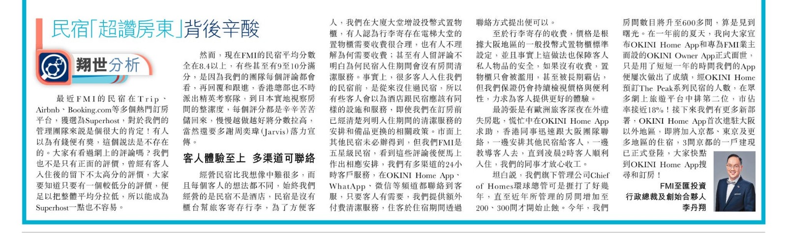 坦白說,我們旗下管理公司Chief of Homes環球總管可是捱打了好幾年,直至近年所管理的房間增加至二、三百間才開始止蝕。今年,我們房間數目將升至六百多間,算是捱過黑暗見到曙光。在一年前的夏天,我向大家宣布OKINI Home App 和專為FMI 業主而設的OKINI Owner App正式面世,只是用了短短一年的時間我們的App便屢次做出了成績,經OKINI Home預訂The Peak系列民宿的人數,在眾多線上旅遊平台中排第二位,佔有率接近18%!接下來我們有更多新部署,OKINI Home App首次進駐大阪以外地區,即將加入京都、東京及更多地區的住宿,三間京都的一戶建現已正式登陸,大家快點到OKINI Home App搜尋和訂房!