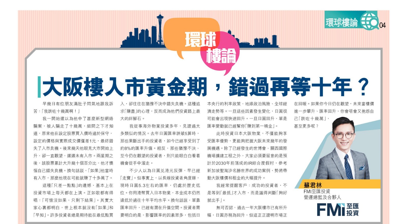 我經常提醒客戶:成功的投資者,不是等到「最抵」才入市,而是識得判斷「夠好就出手」。 無可否認,過去一年大阪樓市已有所升幅,日圓亦稍為回升,但這正正證明市場正在回暖。如果你今日仍在觀望,未來當樓價進一步攀升、匯率回升,你會唔會又抱怨自己「跌咗十幾萬」,甚至更多呢?