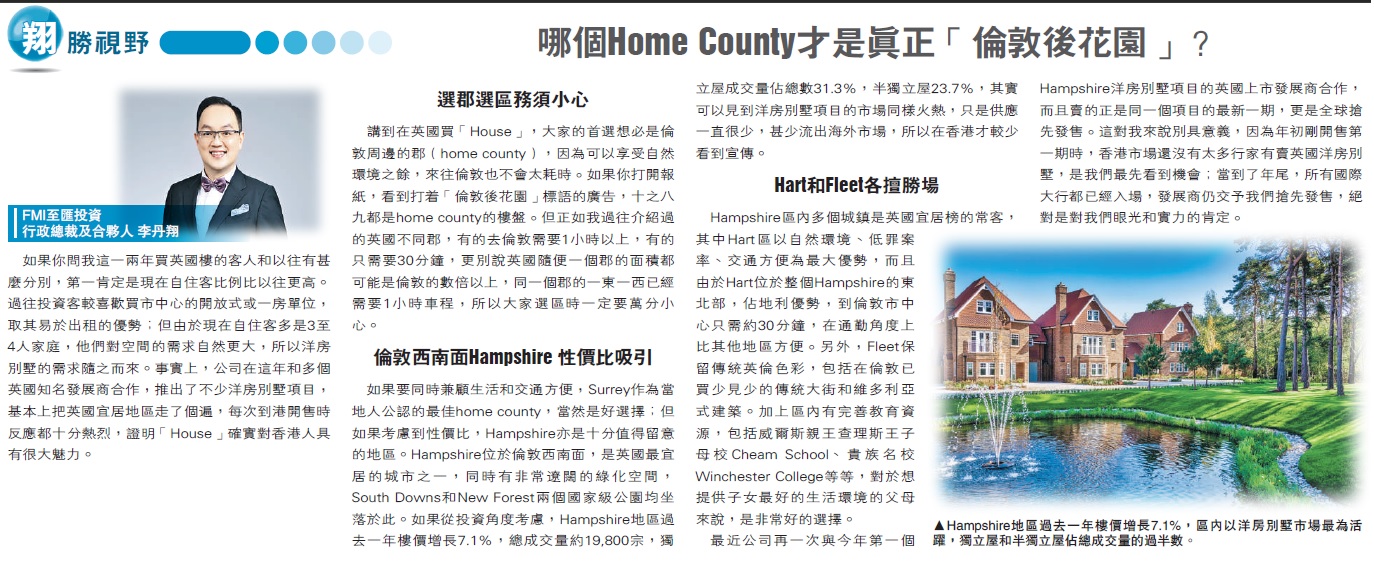 如果你問我這一兩年買英國樓的客人和以往有甚麼分別,第一肯定是現在自住客比例比以往更高。過往投資客較喜歡買市中心的開放式或一房單位,取其易於出租的優勢;但由於現在自住客多是3至4人家庭,他們對空間的需求自然更大,所以洋房別墅的需求隨之而來。事實上,公司在這年和多個英國知名發展商合作,推出了不少洋房別墅項目,基本上把英國宜居地區走了個遍,每次到港開售時反應都十分熱烈,證明「House」確實對香港人具有很大魅力。