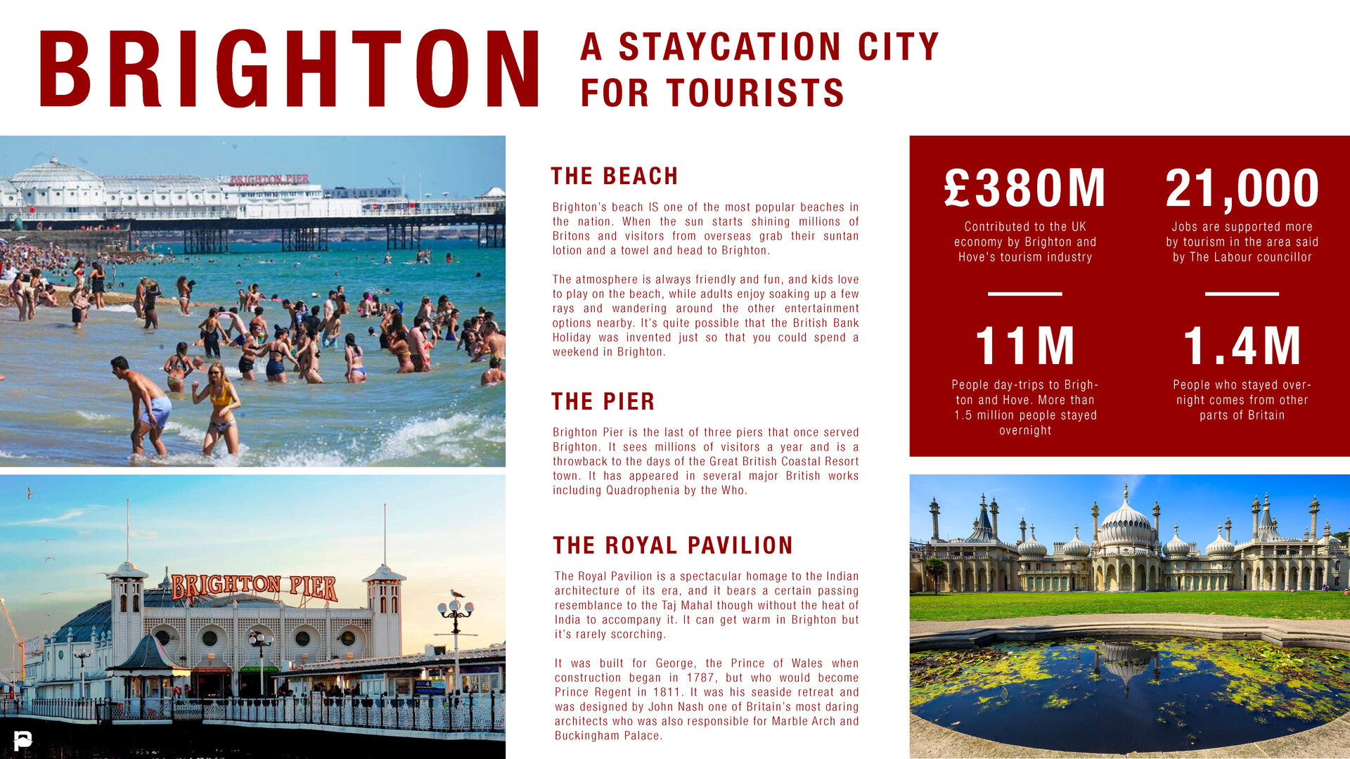 位於倫敦正南方的 Brighton,是英國少數擁有完整海岸線的城市,遙望對岸就是法國北部。Brighton 天氣較為晴朗,城鎮的海岸線有各種大小的沙灘組成,擁有完美的海岸線風景面貌,也因而成為英國本地的旅遊勝地。不容小覷 Brighton 的實力,這個海岸城市的過夜逗留旅客量最高峰每年高達 167 萬人次,單靠旅遊業已為英國貢獻了 3 億 8 千萬鎊的收益。