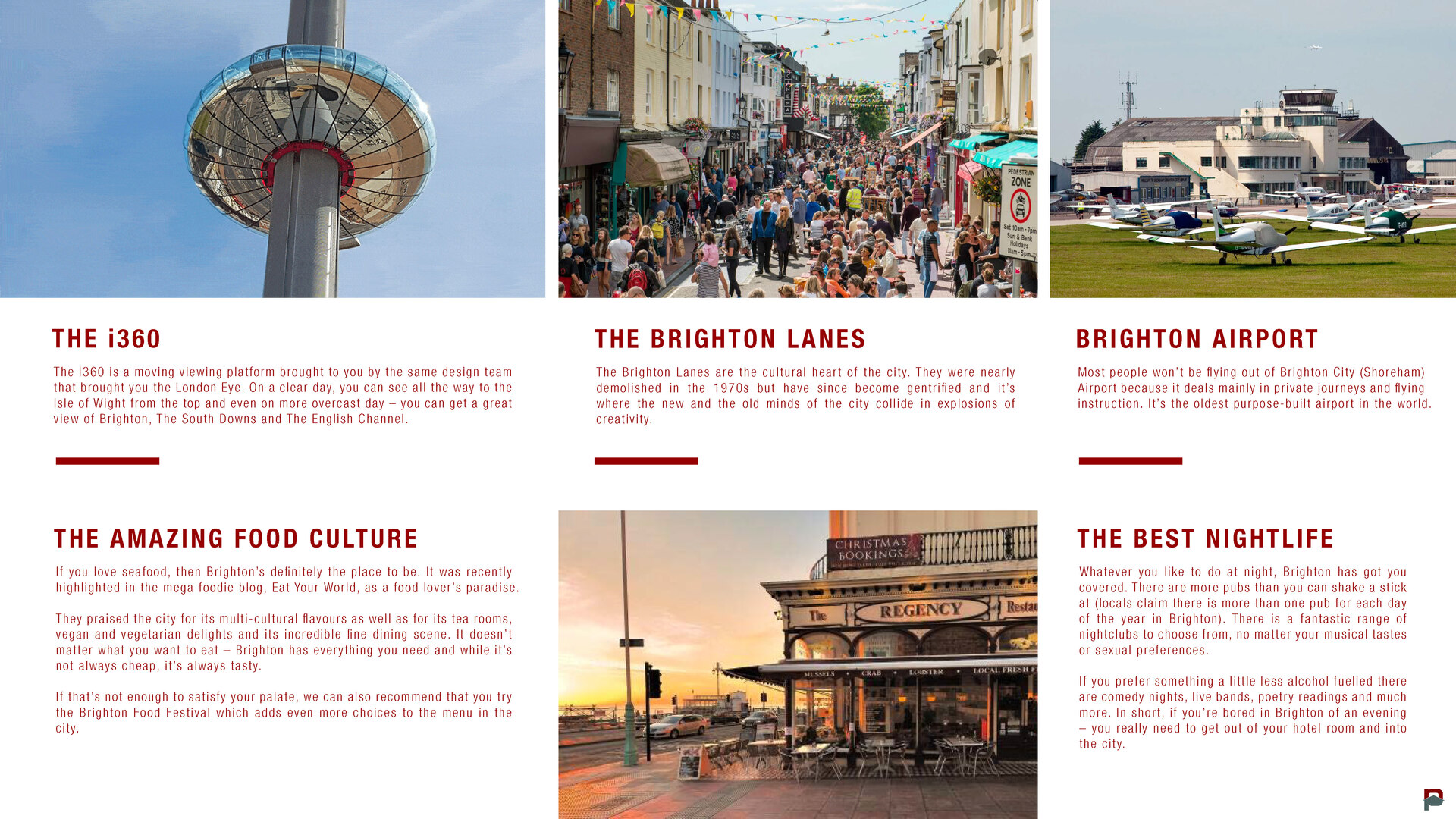 Brighton 市內的設施和配套非常齊全,包括體育館、博物館、遊樂場、商場等一應俱全,區內亦有兩所知名大學,因此 Brighton 亦有被稱為「海上倫敦」的說法,更是。除此之外,前往歐洲各城市的交通樞紐 Gatwick Airport 亦處於 Brighton 和倫敦之間,因此 Brighton 可謂擁有優越的交通網絡。Brighton 是年輕活力充沛的都市,吸引很多藝術家和年輕人聚居此處,逐漸成為歐洲其中一個文化中心,帶動 Brighton 的發展。因此,Brighton 亦獲泰晤士報選為 2022 年英國最佳居住城市之一。