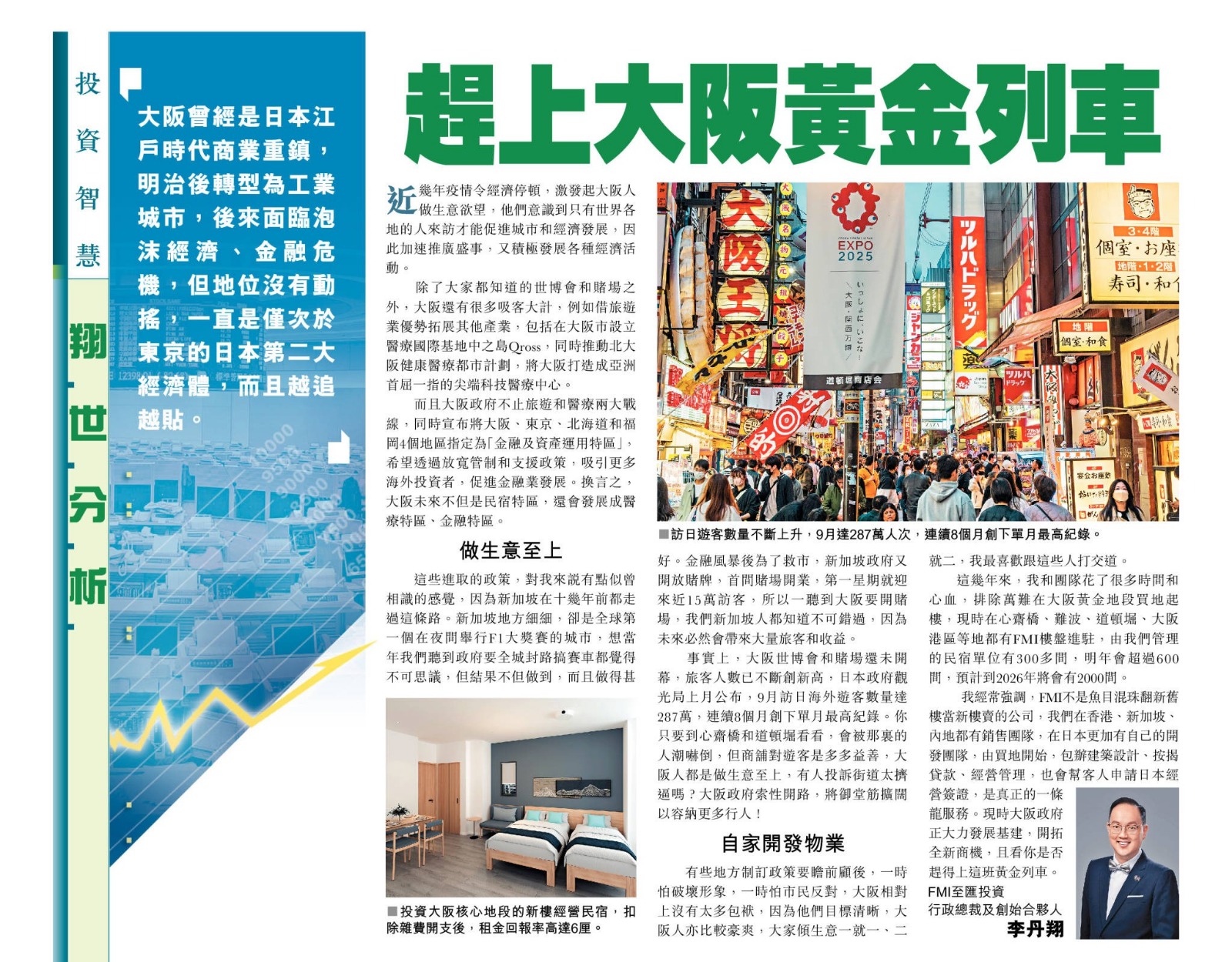 這幾年來,我和團隊花了很多時間和心血,排除萬難在大阪黃金地段買地起樓,現時在心齋橋、難波、道頓堀、大阪港區等地都有FMI的樓盤進駐,由我們管理的民宿單位有三百多間,明年會超過六百間,預計到後年將會有二千間。我經常強調,FMI不是魚目混珠翻新舊樓當新樓賣的公司,我們在香港、新加坡、內地都有銷售團隊,在日本更加有自己的開發團隊,由買地開始,包辦建築設計、按揭貸款、經營管理,也會幫客人申請日本經營簽證,是真正的一條龍服務。現時大阪政府正大力發展基建,開拓全新商機,且看你是否趕得上這班黃金列車。