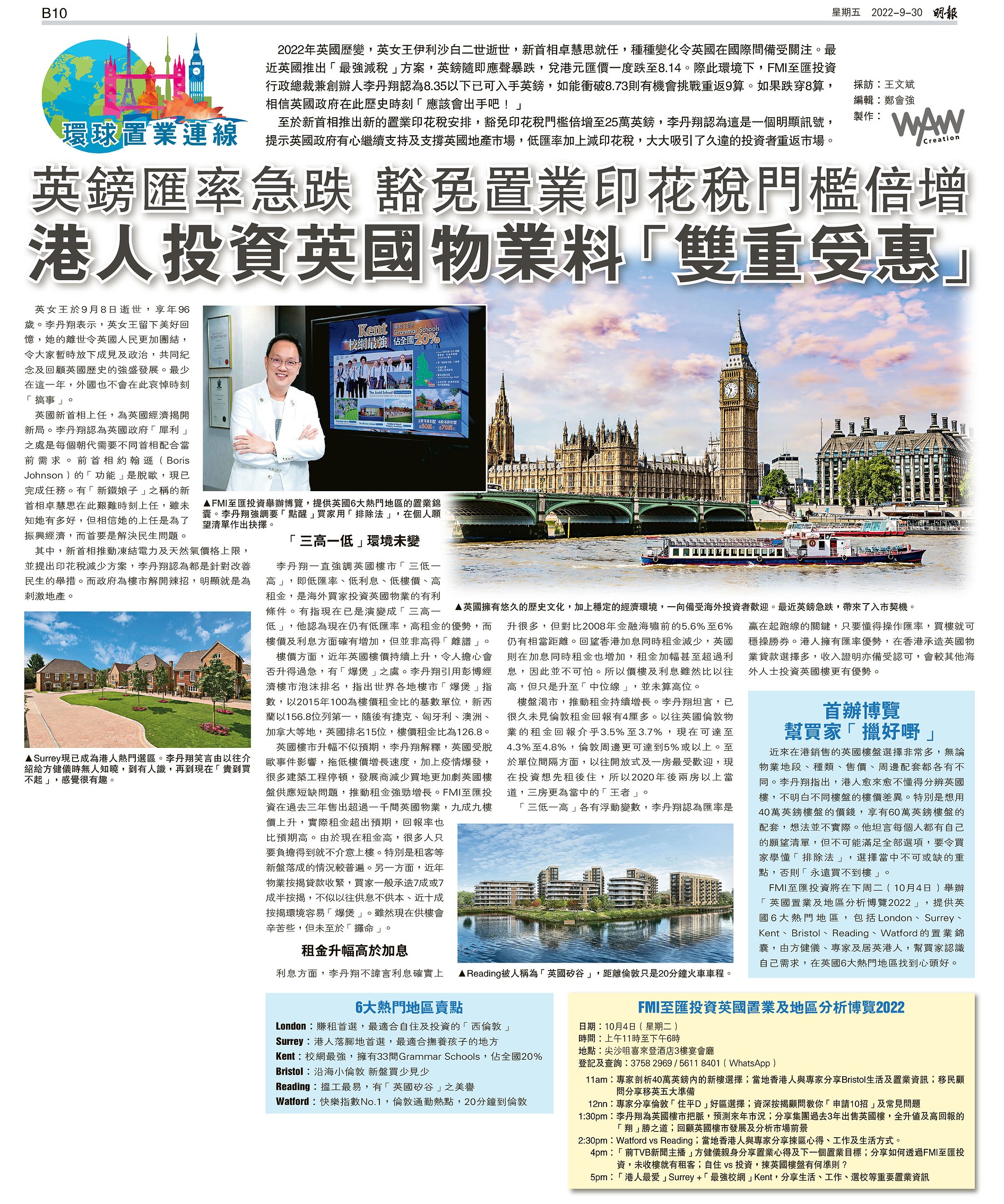 FMI至匯投資將在下周二(10月4日)舉辦「英國置業及地區分析博覽2022」,提供英國6大熱門地區,包括London、Surrey、Kent、Bristol、Reading、Watford的置業錦囊,由方健儀、專家及居英港人,幫買家認識自己需求,在英國6大熱門地區找到心頭好。