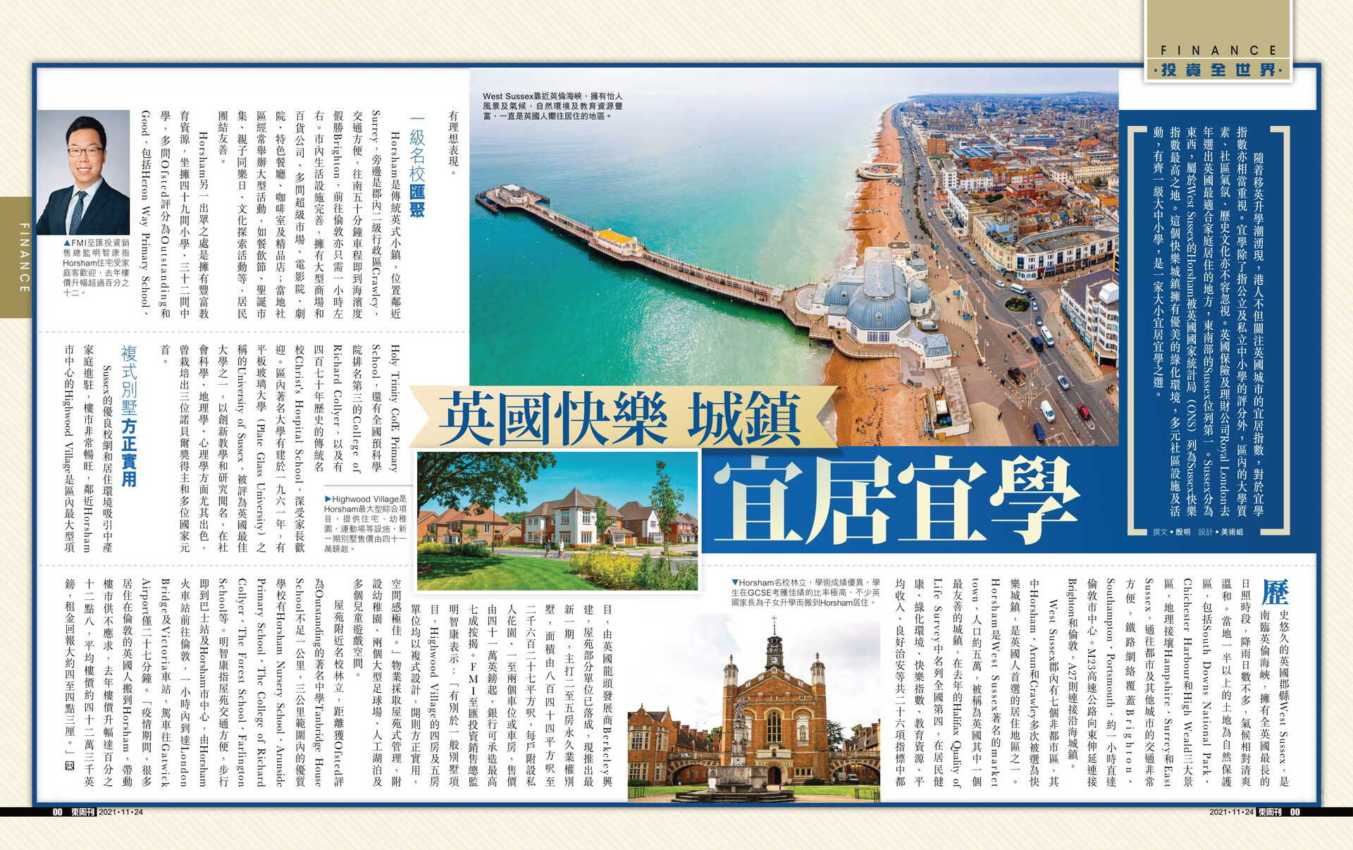 隨着移英升學潮湧現,港人不但關注英國城市的宜居指數,對於宜學指數亦相當重視。宜學除了指公立及私立中小學的評分外,區內的大學質素、社區氣氛、歷史文化亦不容忽視。英國保險及理財公司Royal London去年選出英國最適合家庭居住的地方,東南部的Sussex位列第一。Sussex分為東西,屬於West Sussex的Horsham被英國國家統計局(ONS)列為Sussex快樂指數最高之地。這個快樂城鎮擁有優美的綠化環境,多元社區設施及活動,有齊一級大中小學,是一家大小宜居宜學之選。
