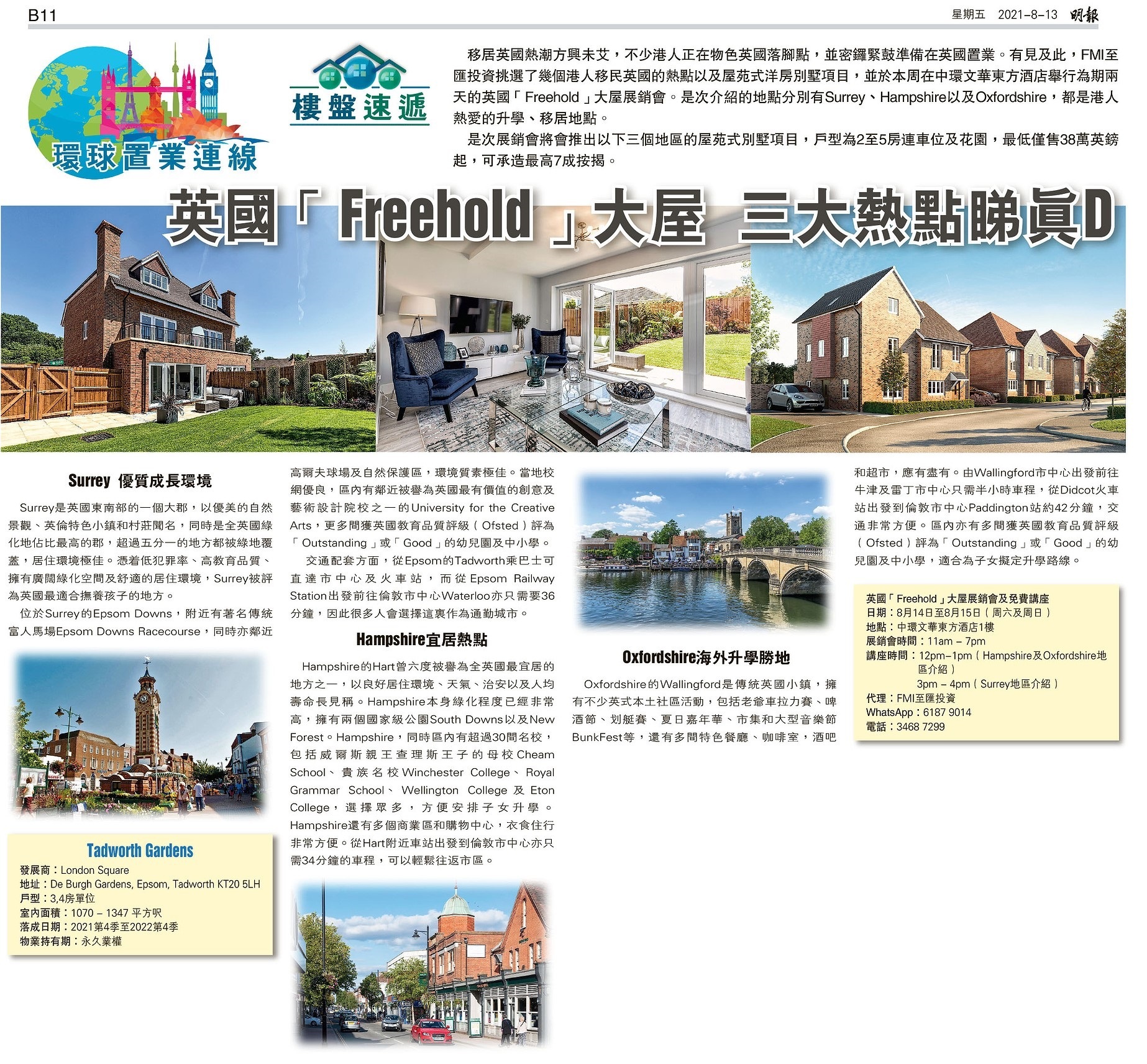 移居英國熱潮方興未艾,不少港人正在物色英國落腳點,並密鑼緊鼓準備在英國置業。有見及此,FMI至匯投資挑選了幾個港人移民英國的熱點以及屋苑式洋房別墅項目,並於本周在中環文華東方酒店舉行為期兩天的英國「Freehold」大屋展銷會。是次介紹的地點分別有Surrey、Hampshire以及Oxfordshire,都是港人熱愛的升學、移居地點。