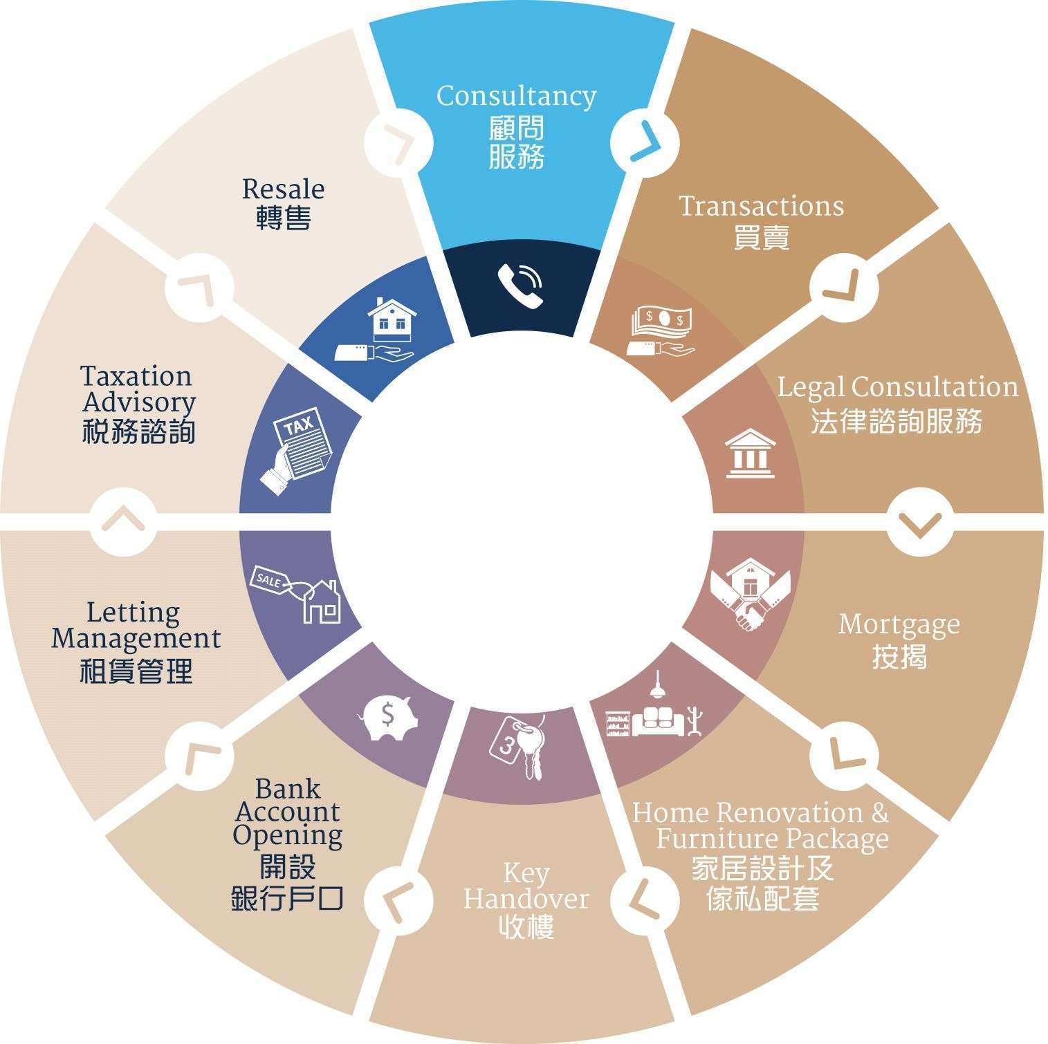 我們的360°全方位商業模式能準確切合客戶需要,並提供全方位服務,包括顧問服務、買賣、按揭、收樓、轉售、租賃管理、稅務諮詢等事項,均有專人緊貼每個交易步驟,助您輕鬆順利完成交易。